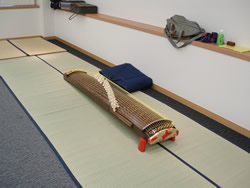 控え室はきれいでした。テーブル席にはお茶の用意もしていただいていました。写真は出番を待つ私の17絃箏。本番は口前のカバーははずし、箏足を付けて演奏しました。